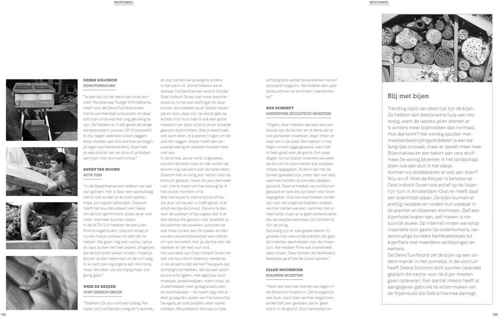 Hannie van den Bergh, kunstenaar en vormgever, en de initiatiefnemer van dit project. Twee jaar geleden ben ik begonnen met moestuinieren en kwam ik in aanraking met stadslandbouw. Ik was verbaasd om te zien hoeveel initiatieven er de grond uit schieten en met hoeveel enthousiasme hieraan gewerkt wordt. Hier wilde ik iets mee doen. Ik verzorg de visuele communicatie van oa. de Groene Fred, Zuiderkruid en Platform Eetbaar Amsterdam.